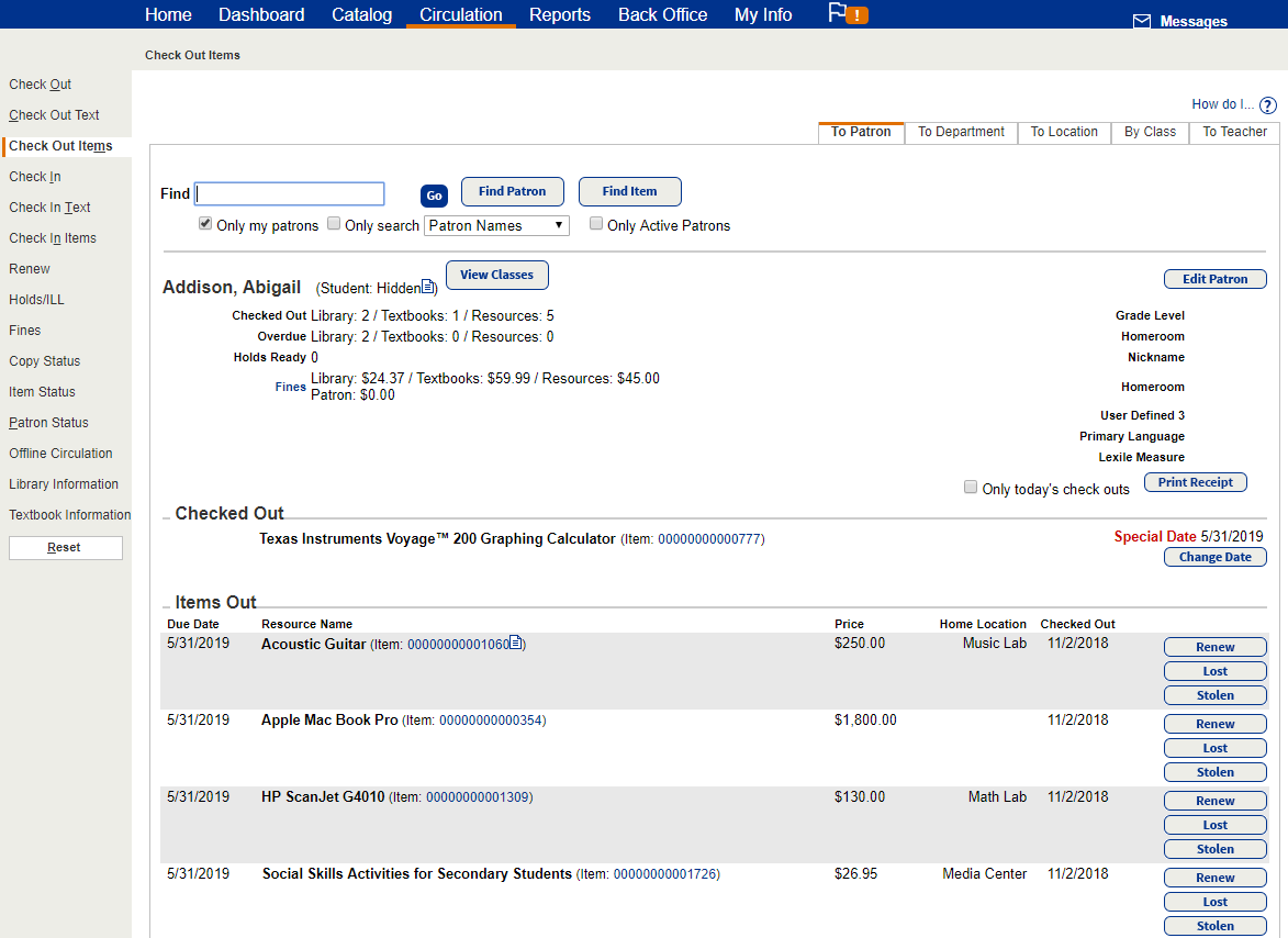 - Select Circulation > Check Out Items > To Patrons sub-tab.